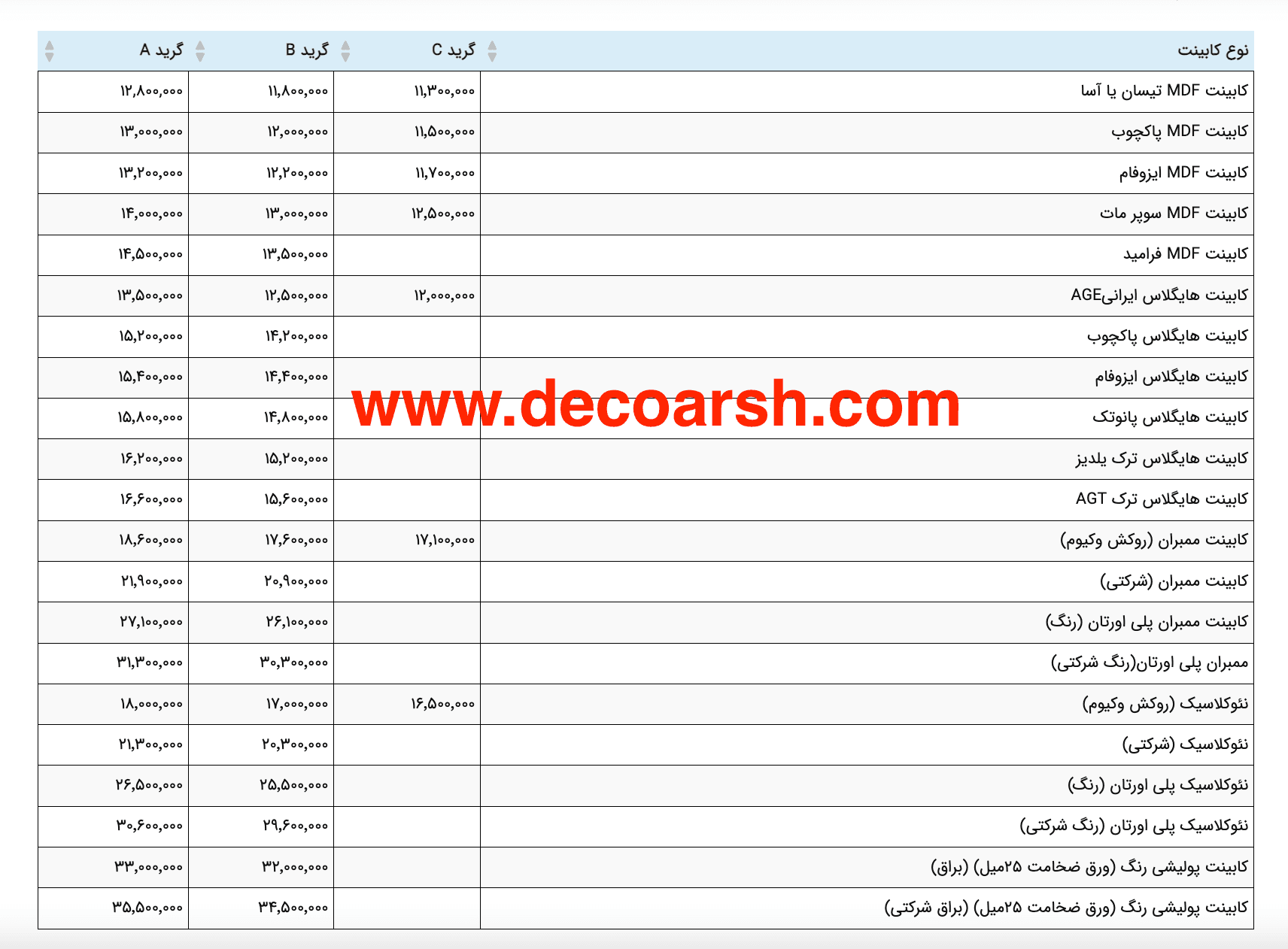 گرید A و B و C که هر بخش بر اساس کیفیت یراق آلات و MDF بدنه قیمت گذاری شده است.